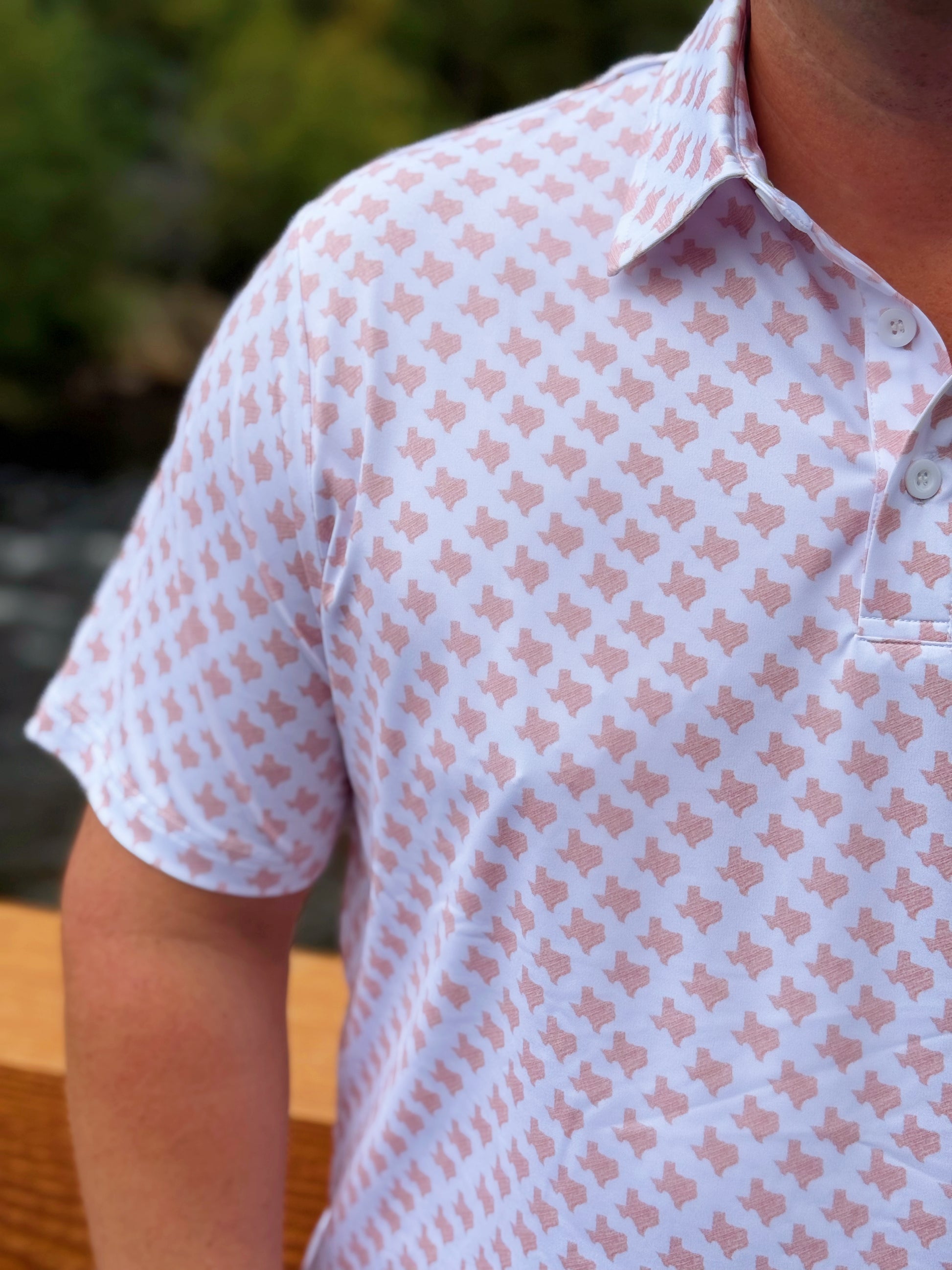 The Henry Performance Polo by Washco Apparel combines a clean white background with a bold orange Texas print, embodying University of Texas spirit perfectly for game day. This expertly designed apparel blends team pride with timeless style, ensuring you look sharp and support your Longhorns comfortably throughout the season.