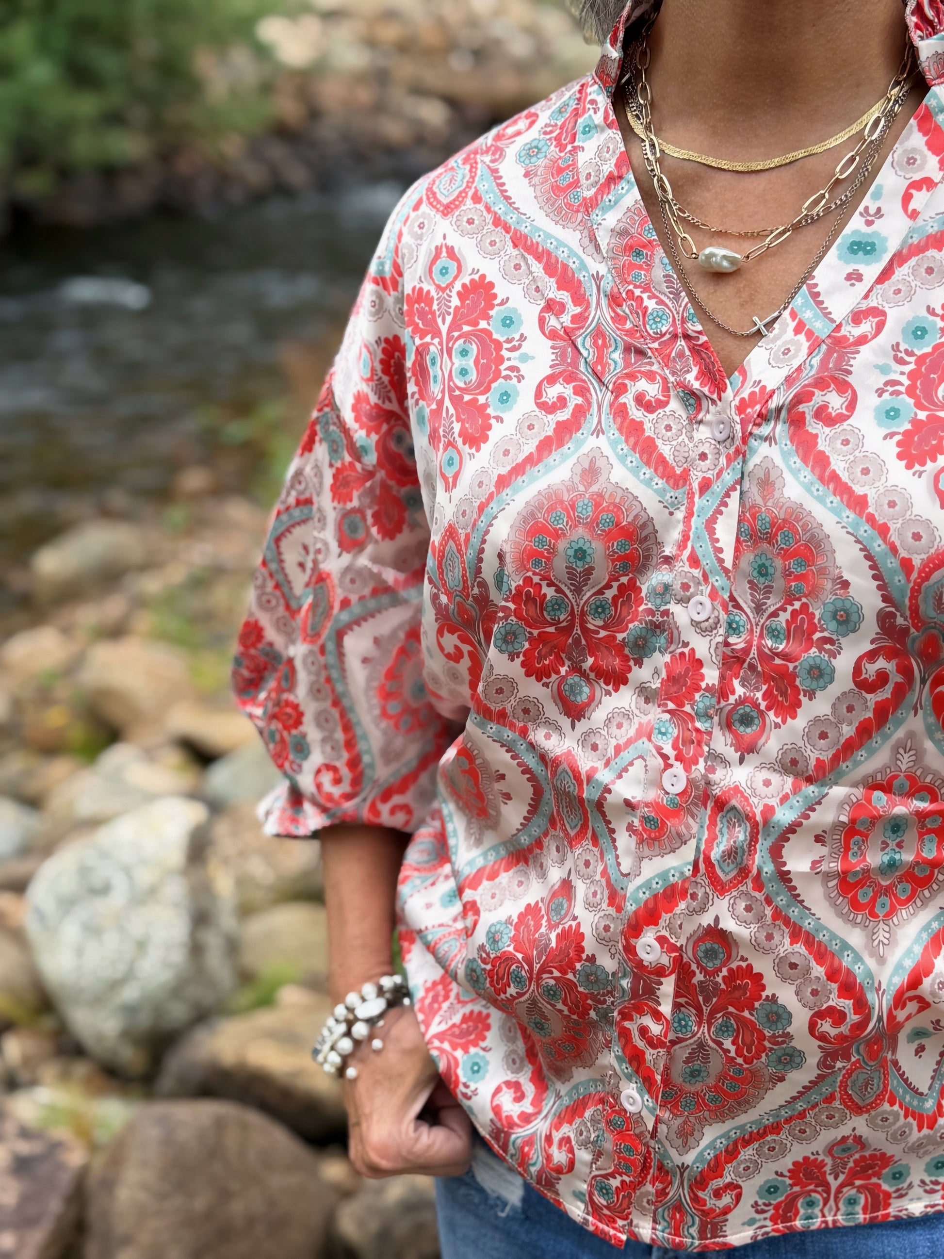 The Julia blouse by Washco Apparel combines timeless paisley print with a vibrant palette of tan, coral, and teal for a standout look. Featuring a flattering v-neck and three-quarter length sleeves, it offers both style and comfort. The button-down design adds versatility, making it perfect for casual outings or office wear. Elevate your wardrobe with this effortlessly chic piece.