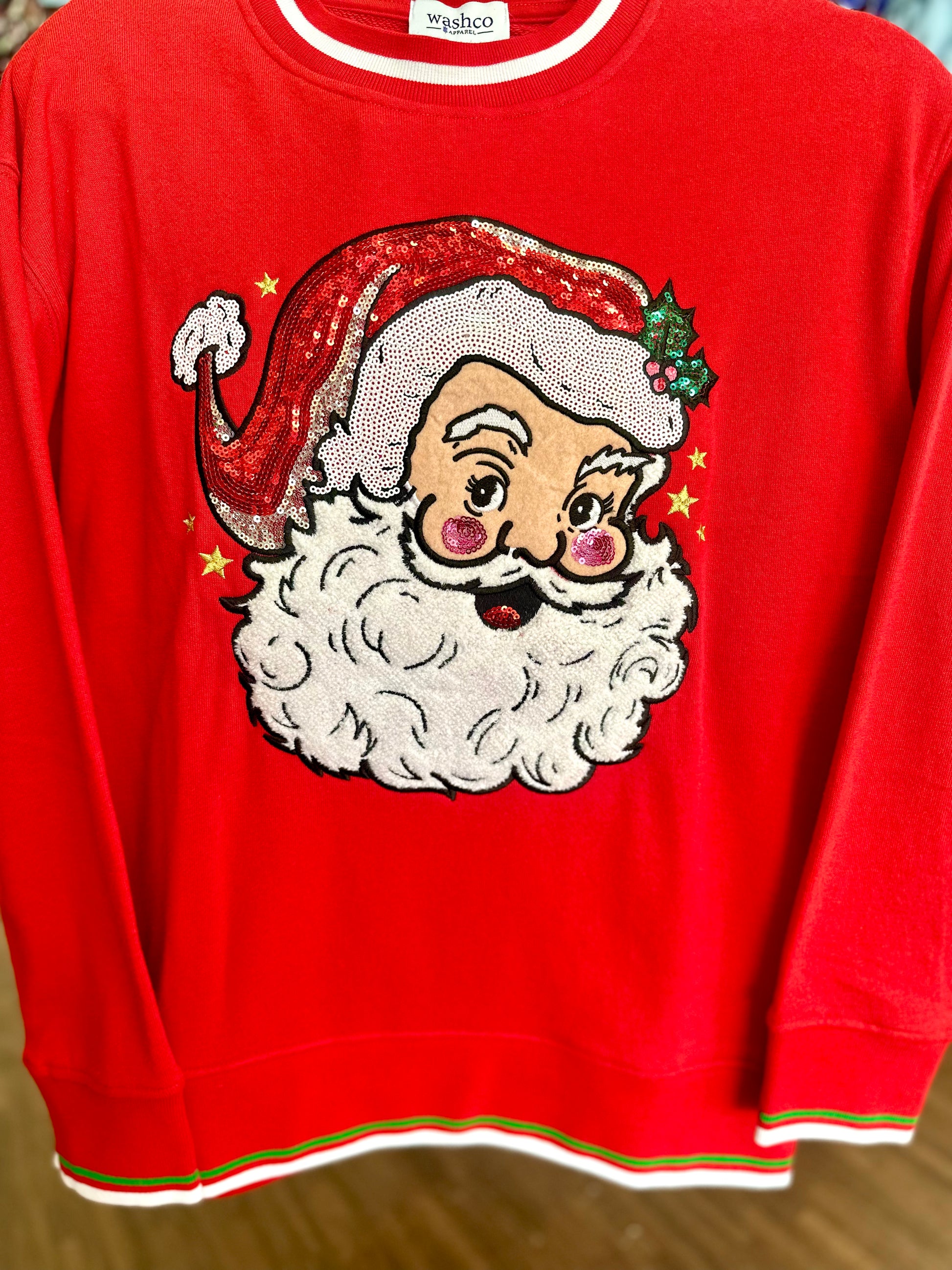 Add festive sparkle to your holiday wardrobe with this Santa sweatshirt by Washco Apparel. Crafted for both style and comfort, it combines a classic Santa design with eye-catching sparkle, perfect for standing out at Christmas parties or seasonal events. Made from soft, durable fabric, this sweatshirt ensures warmth while the sequins add a touch of glamour to traditional holiday attire. Elevate your Christmas look with this expertly designed, sparkling Santa sweatshirt.