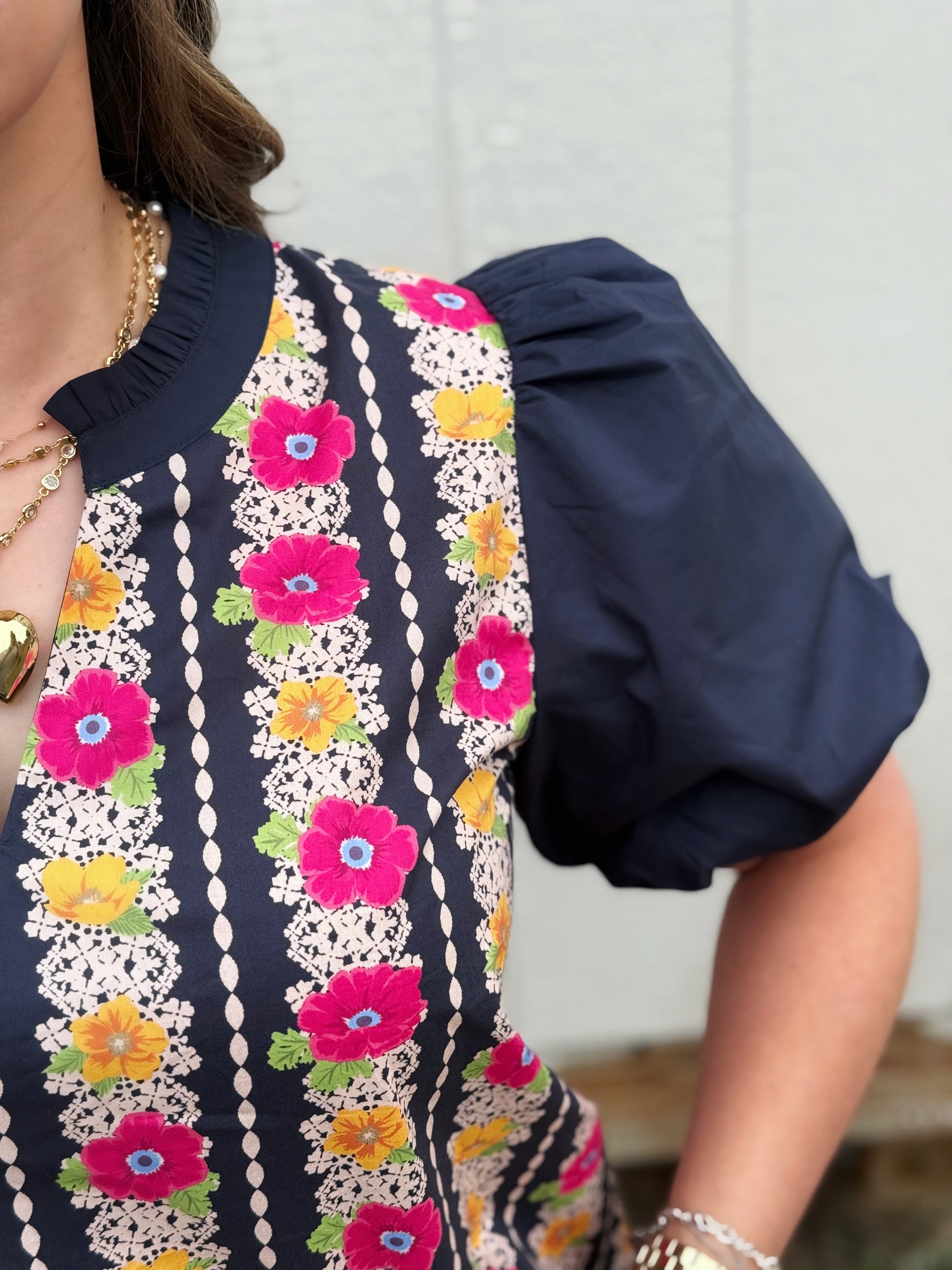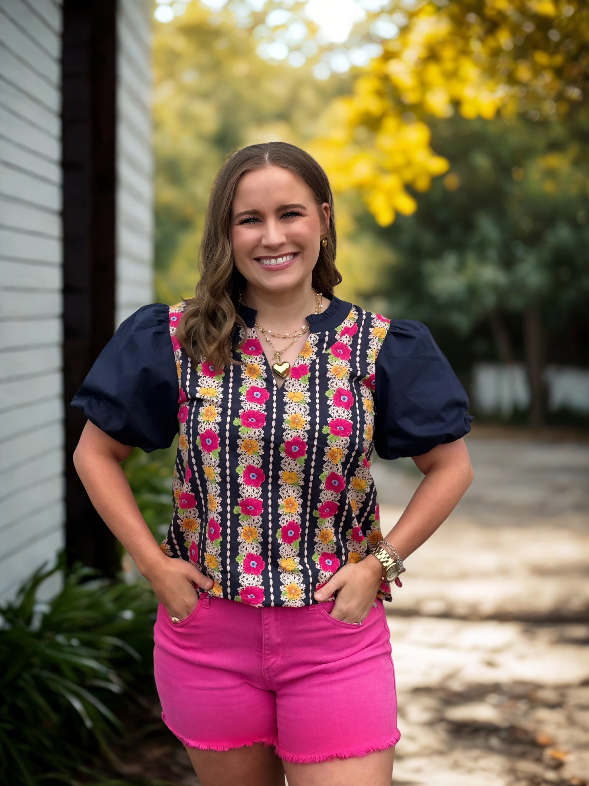 Printed colorful floral stripe design, solid navy sleeves and v-notched neckline.